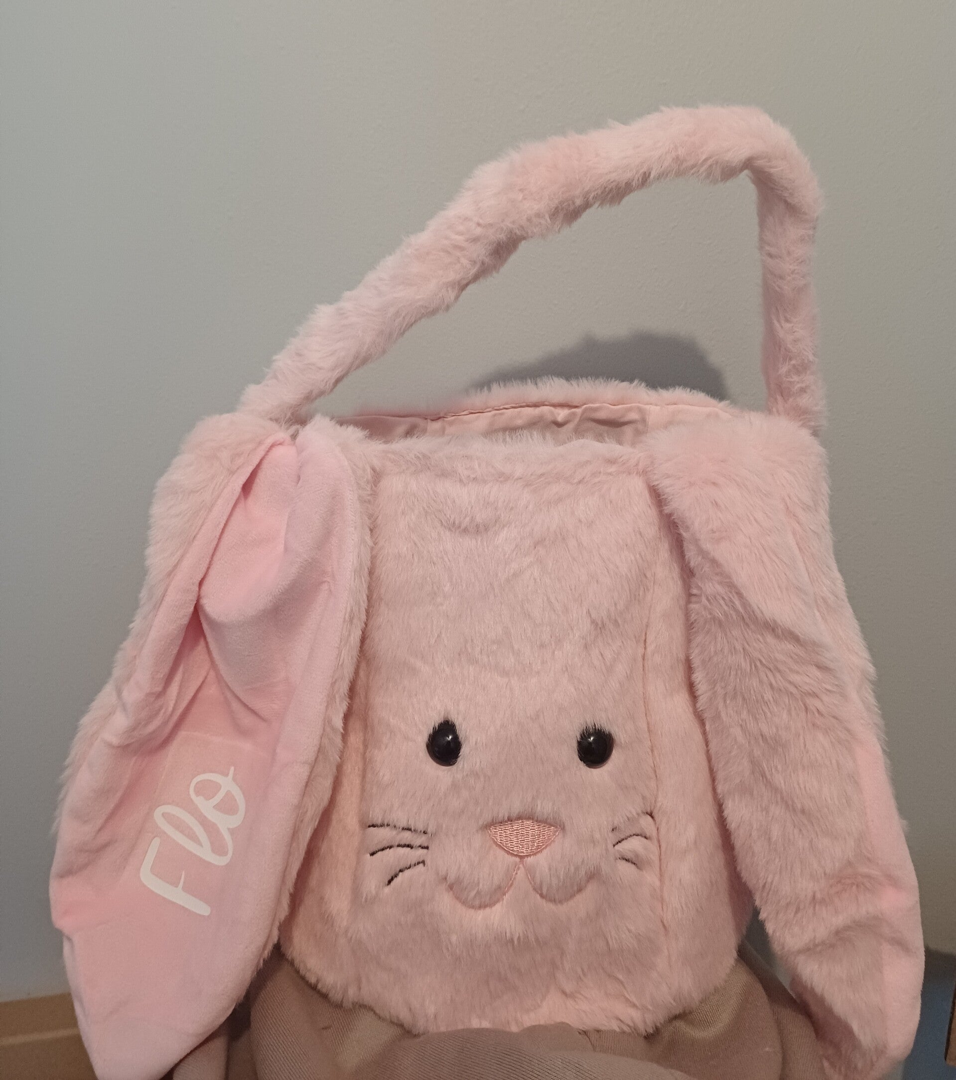 Het mandje heeft een afmeting van 25 cm op 22 cm (handvat inbegrepen), wat kleiner dan zijn grote broer, maar nog steeds groot genoeg voor véél paaseitjes! Daarenboven is het superzacht en fluffy, heerlijk! Het mandje is beschikbaar in roze en bruin. De naam wordt gedrukt in zwart of wit.